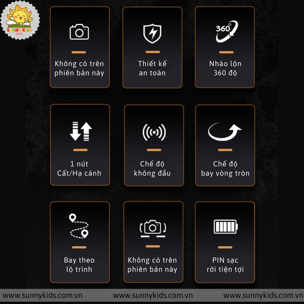 - Giữ cố định độ cao, Bay lơ lửng tại chỗ, Tiến/Lùi, Lên/Xuống, Trái/Phải, nhào lộn 360 độ, bay vòng tròn