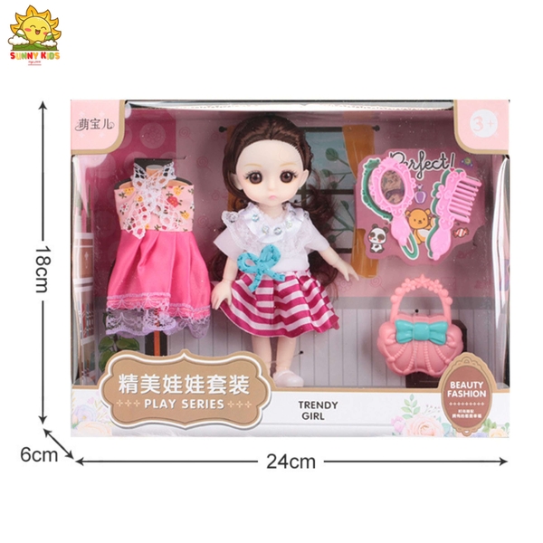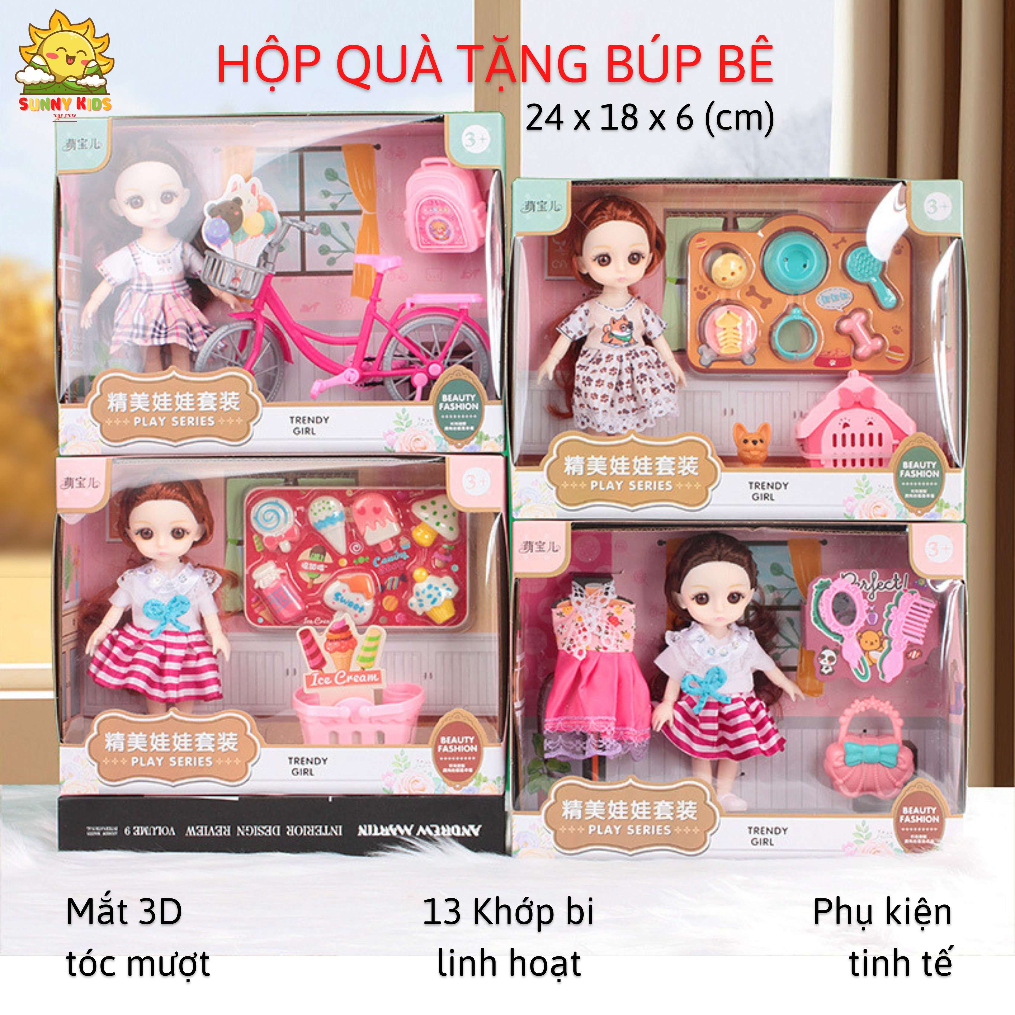 Hộp quà tặng Búp bê cho bé gái, dài 24cm, mắt 3D, tóc mượt, váy dễ giặt, hộp quà búp bê đẹp có quai xách - Sunny Kids