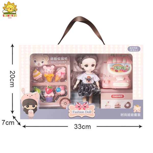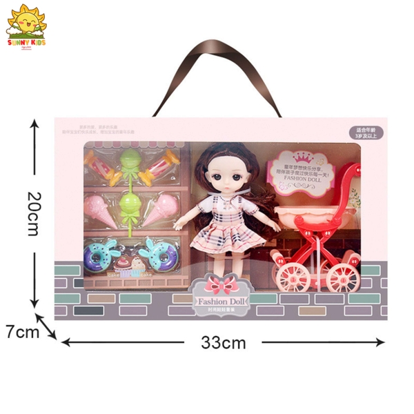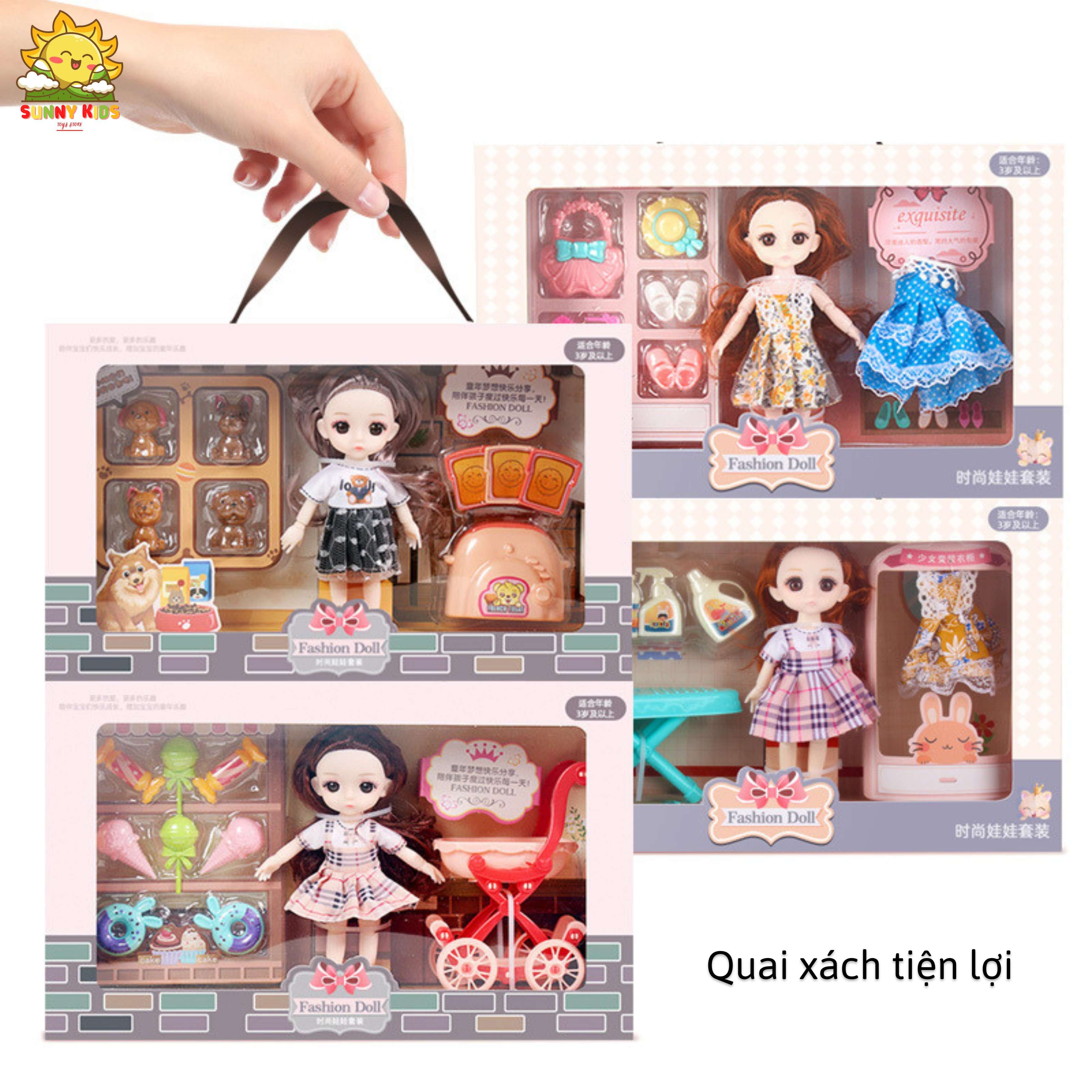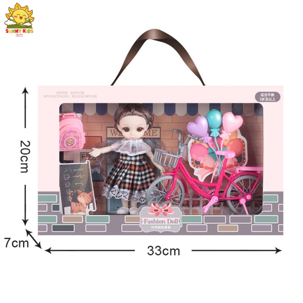 Hộp quà tặng Búp bê cho bé gái, dài 33cm, mắt 3D, tóc mượt, váy dễ giặt, hộp quà búp bê đẹp có quai xách - Sunny Kids