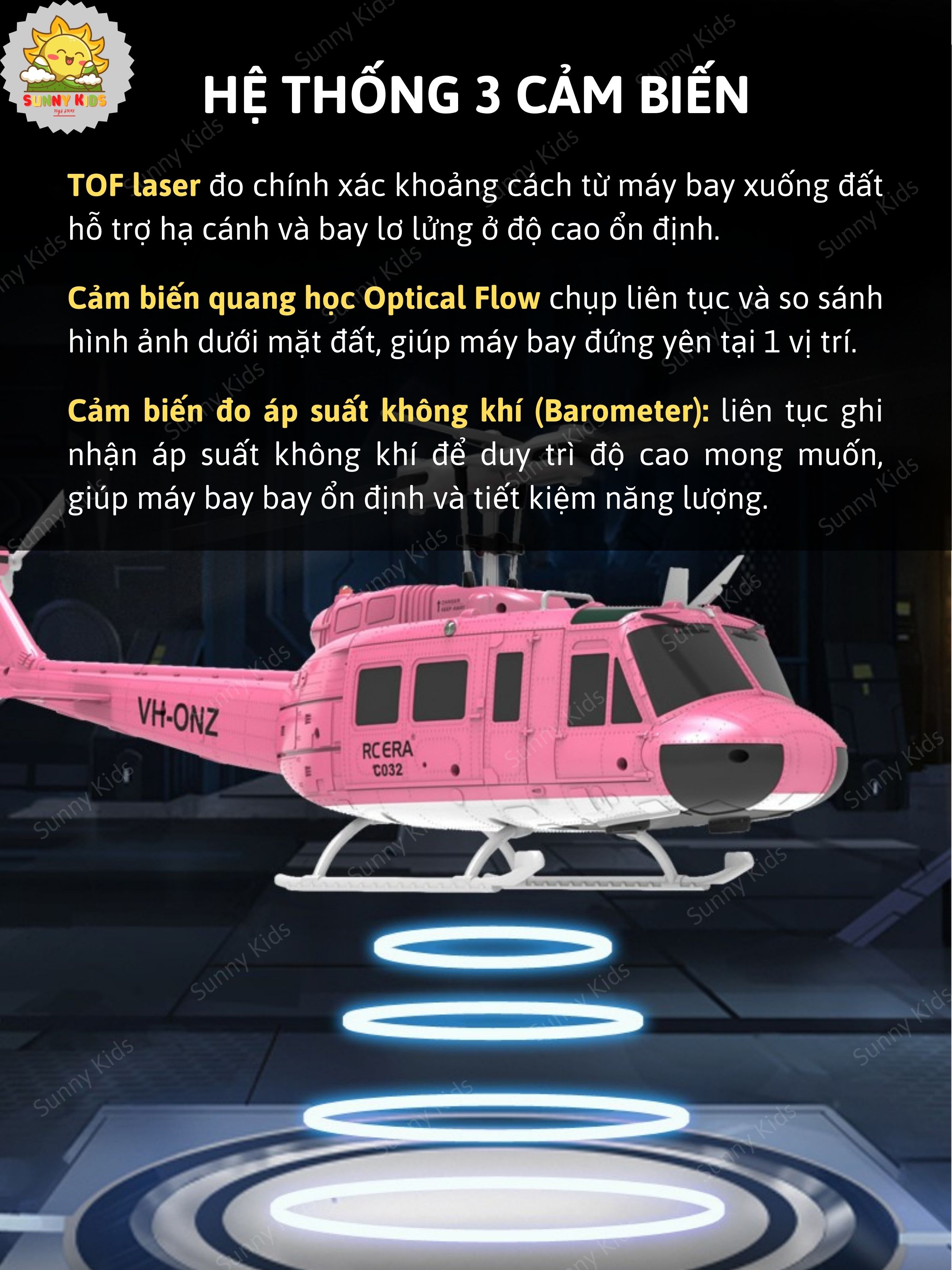 Sunny Kids giới thiệu Máy bay Trực thăng điều khiển từ xa ERA C-032 UH-1 – Tỷ lệ 1:48 lấy cảm hứng từ chiếc trực thăng huyền thoại UH-1. Sản phẩm tích hợp cảm biến quang học, TOF laser và barometer, động cơ không chổi than, cùng chế độ bay 3D lộn ngược một nút bấm, mang đến trải nghiệm bay mạnh mẽ, an toàn và chính xác.